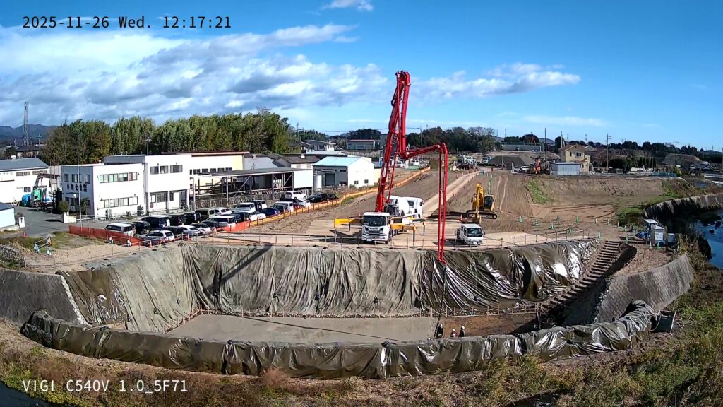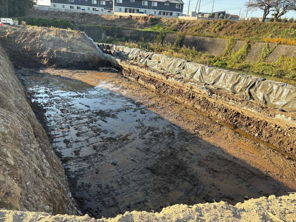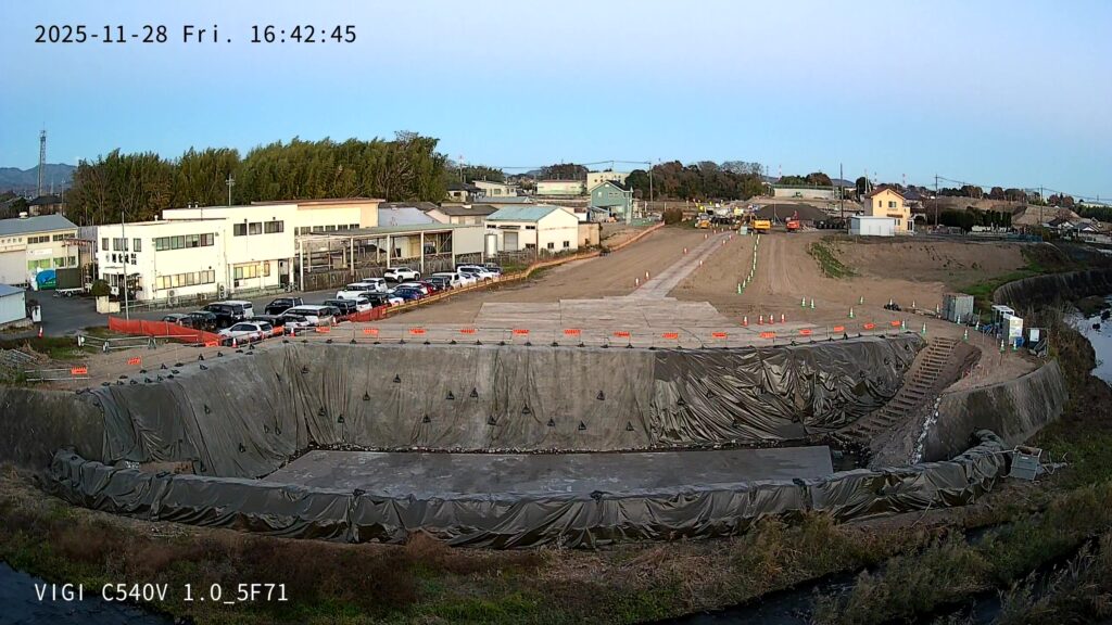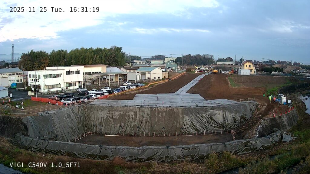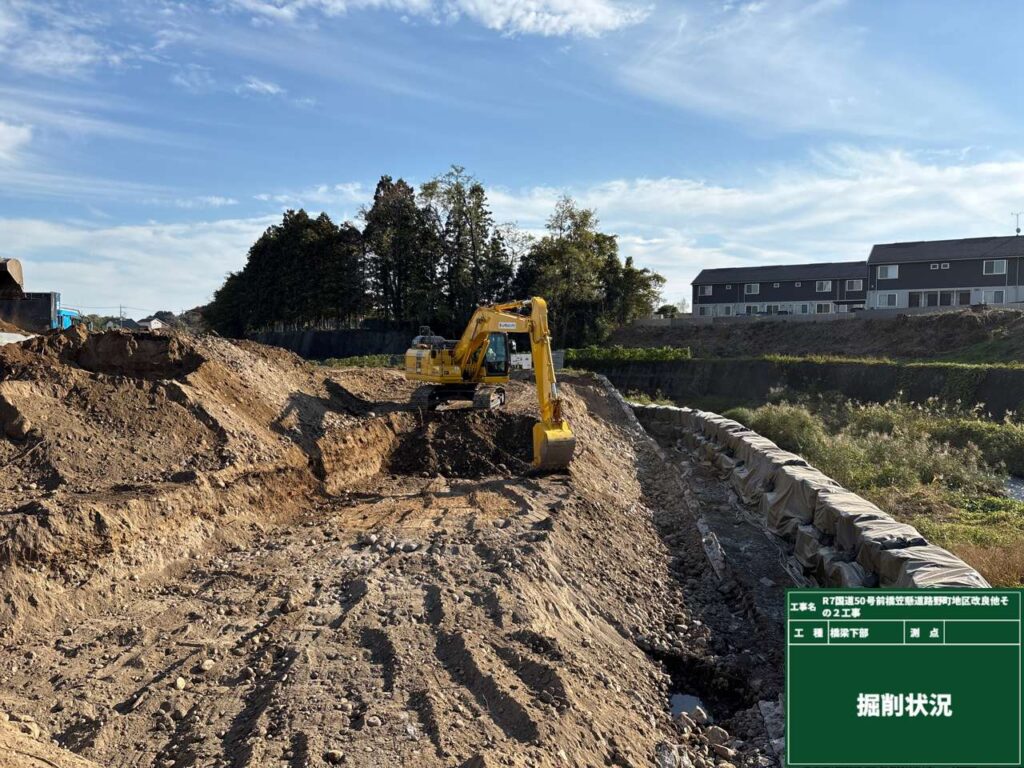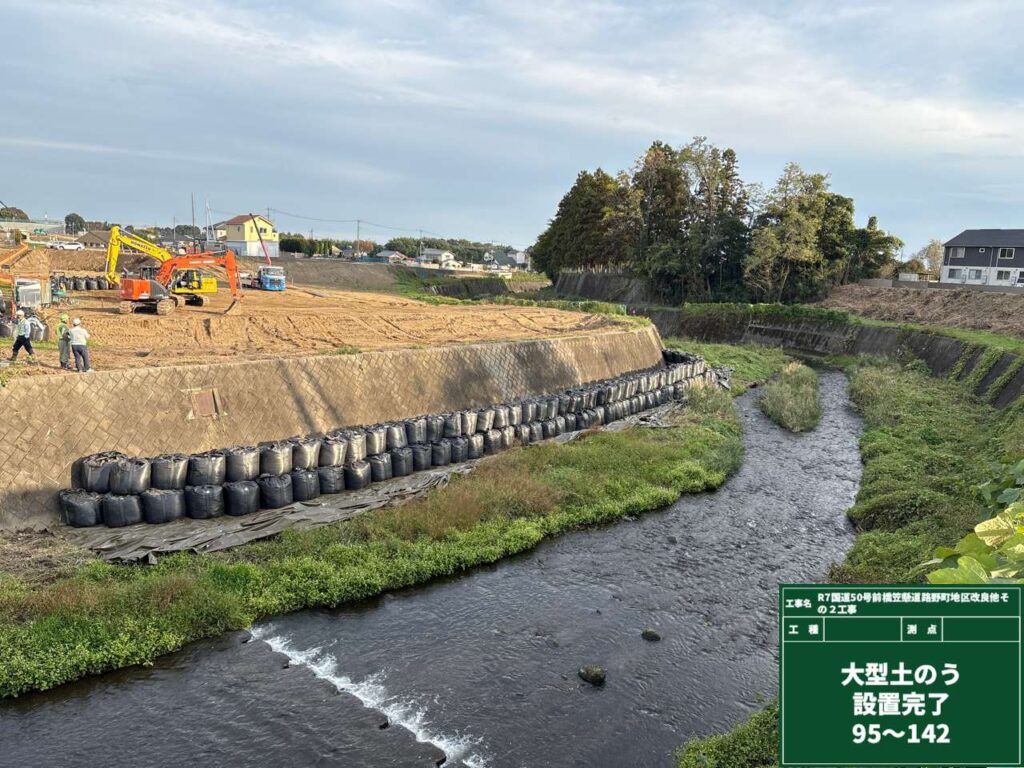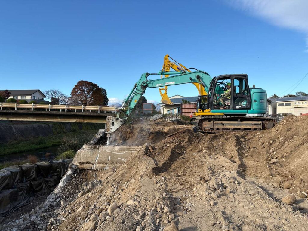 2025年11月の現場状況報告(仮設工 仮堤防設置、仮締切(大型土のう)、既設護岸取壊し、橋台工 床堀~均しコンクリートまで)